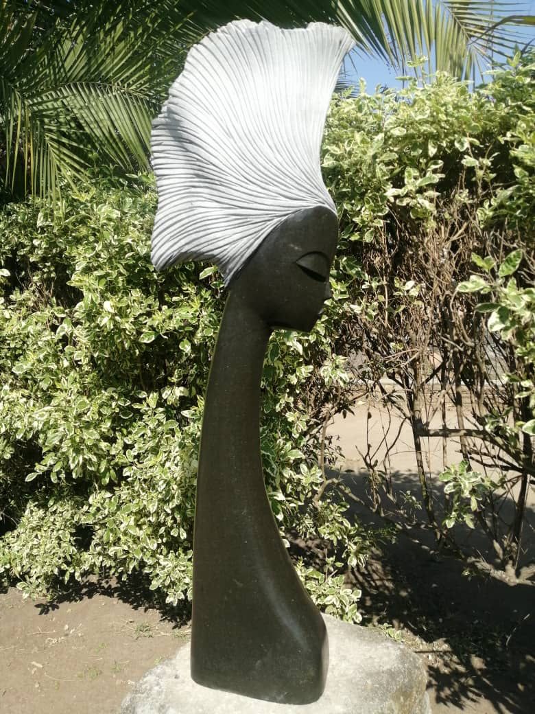 Crafted with mastery, this black and richly colored stone sculpture portrays a woman embracing a moment of her own glory. Her beautiful grey hair stands up, exuding confidence and wisdom. With a powerful stance and a radiant expression, she embodies.